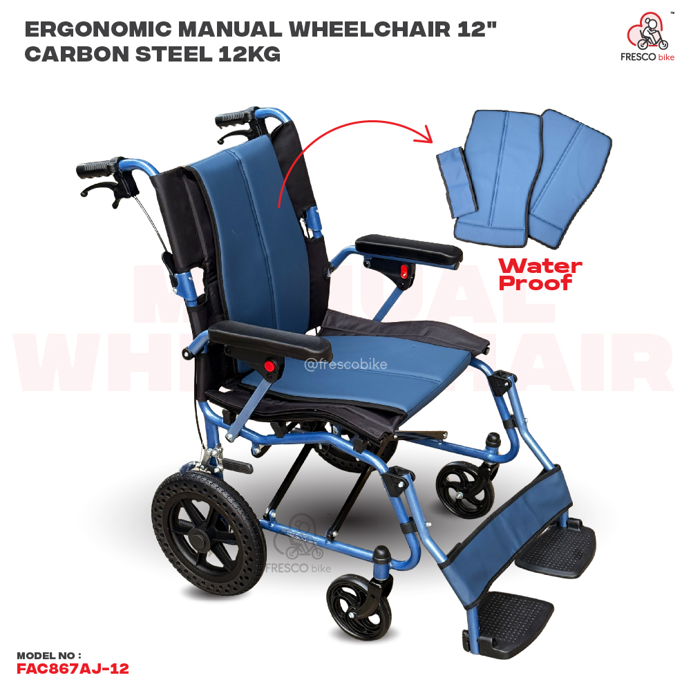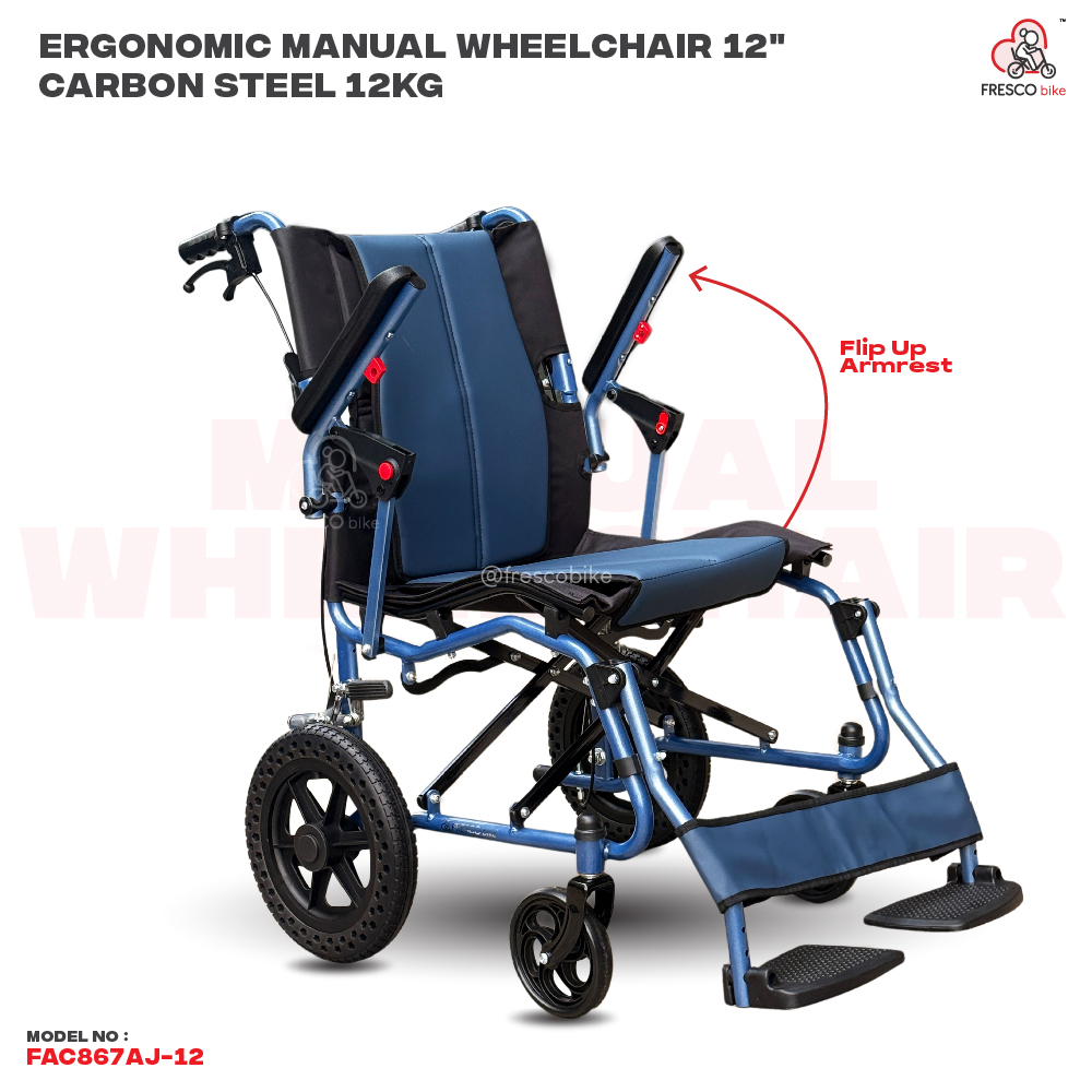 Product Specifications • Model: AC867AJ-12 • Material: Carbon Steel • Surface Color: Blue • Product Size: 96 × 66 × 98 cm • Front Wheel: 6-inch PVC • Rear Wheel: 12-inch PVC • Seat Width: 48 cm • Seat Depth: 42 cm • Seat Height: 49.5 cm • Backrest Height: 50 cm • Armrest Height: 20 cm • Net Weight: 12 kg • Gross Weight: 13.5 kg • Package Quantity: 1 unit • Package Size: 65 × 28 × 78 cm
